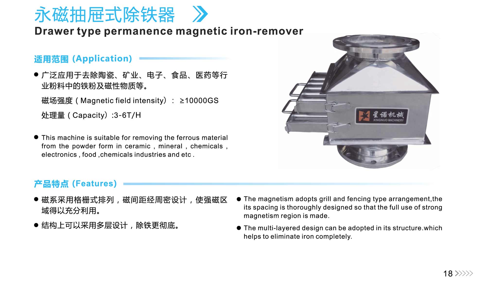 Features | ·The magnetism adopts grill and fencing type arrangement,the its spacing is thoroughly designed so that the full use of strong magnetism region is made. ·The multi-layered design can be adopted in its structure.which helps to eliminate iron completely. |